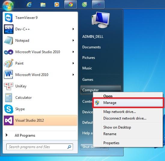 B1: Vào Start--> click chuột phải vào Computer--> chọn Manage.