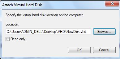 B6: Cuối cùng để cho nó hoạt động vào menu Action--> chọn Attach VHD--> duyệt đến file NewDisk.vhd đã tạo ở bước trên và nhấn OK để gắn vào hệ thống.